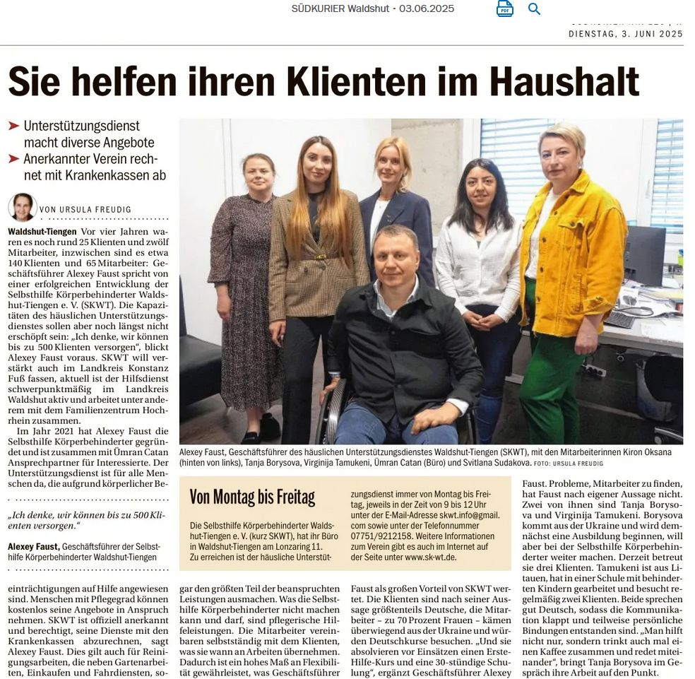 SKWT e.V. in der Presse: Sie helfen ihren Klienten im Haushalt Der Selbsthilfe Körperbehinderter Waldshut-Tiengen e.V. (SKWT e.V.) hat es in die Schlagzeilen geschafft!