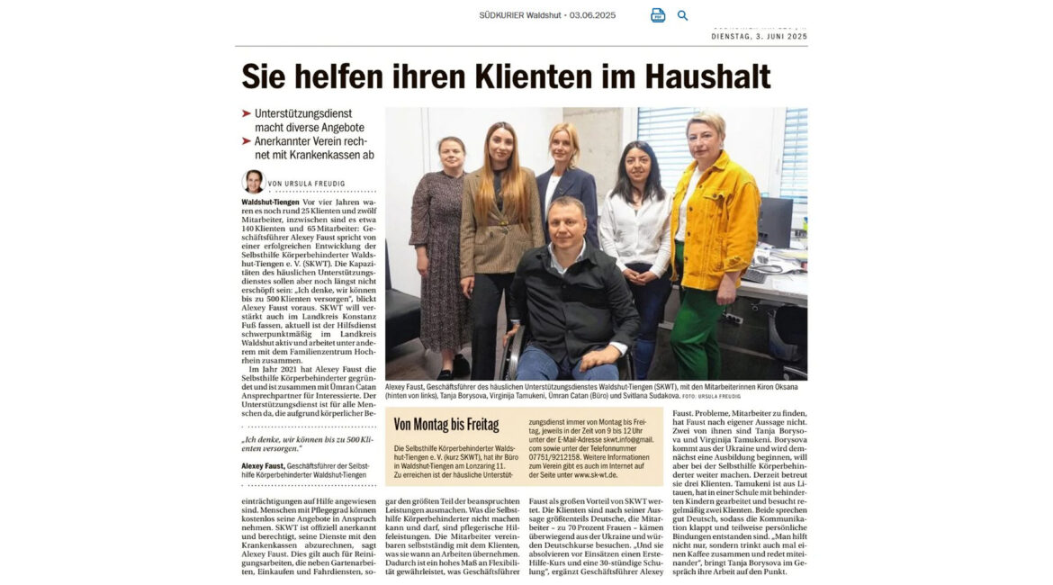 Der Selbsthilfe Körperbehinderter Waldshut-Tiengen e.V. (SKWT e.V.) hat es in die Schlagzeilen geschafft! Unser Engagement und unsere Projekte ziehen zunehmend Aufmerksamkeit auf sich – sei es durch unsere innovativen Ansätze in der Unterstützung von Menschen mit Behinderung oder durch die positiven Geschichten, die wir gemeinsam mit unseren Mitgliedern schreiben.